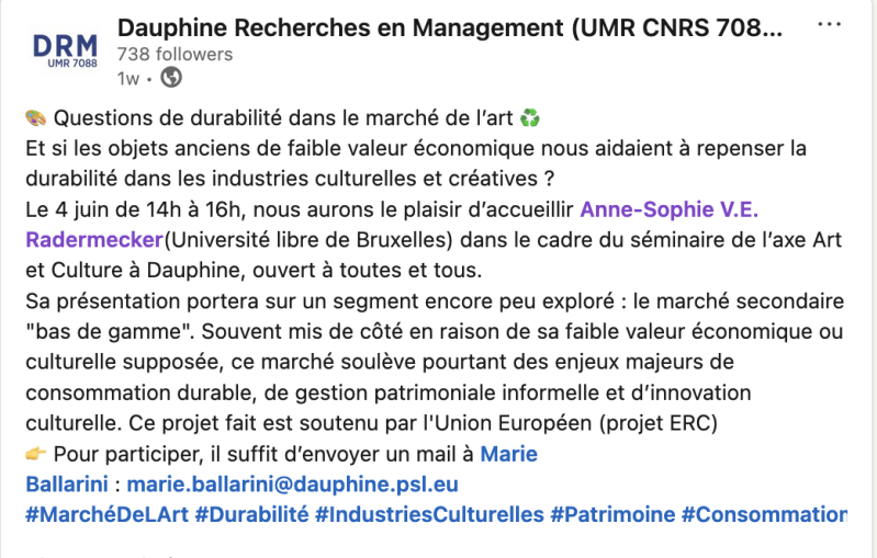 The MOOVA team will give a seminar on the sustainable potential of antiques at Paris-Dauphine University (Dauphine Recherches en Management UMR CNRS)